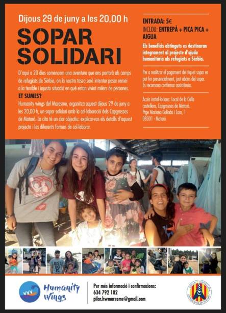 Este Jueves 29 a las 20: 00 h Humanity Wings Maresme con la colaboración de cabezudos de Mataró organiza una cena solidaria. Los beneficios se destinan al proyecto de ayuda humanitaria a los refugiados en Serbia.